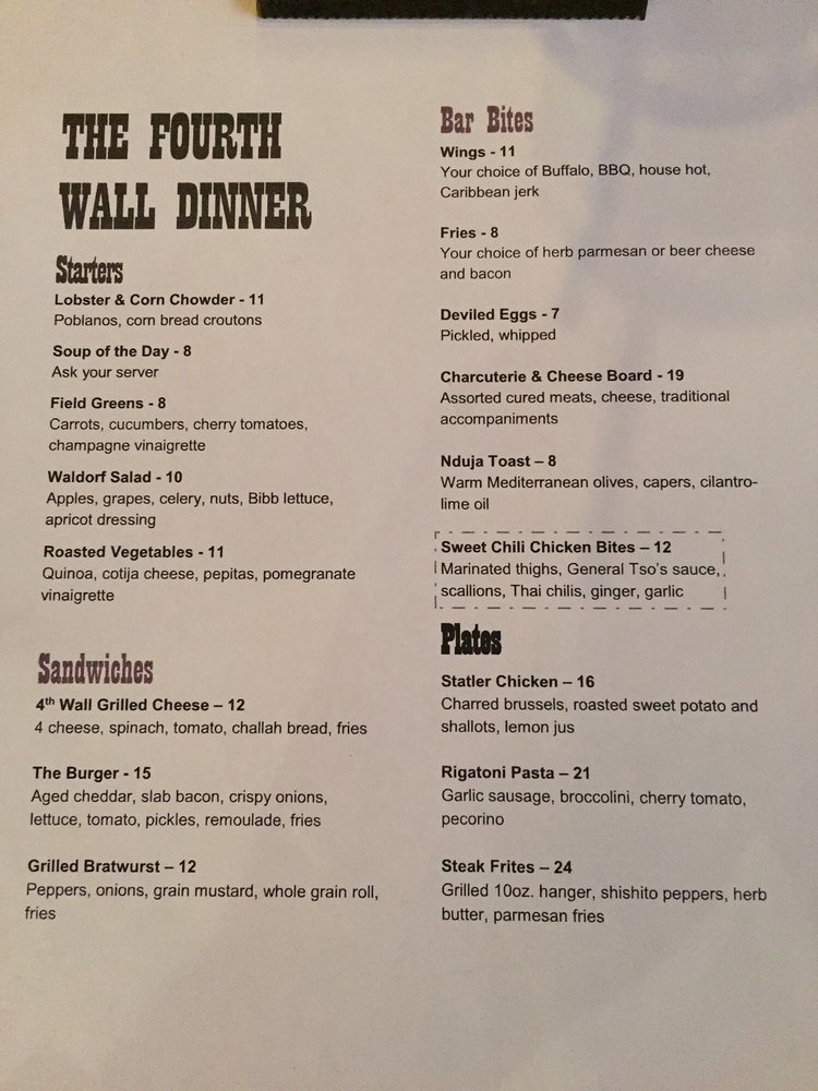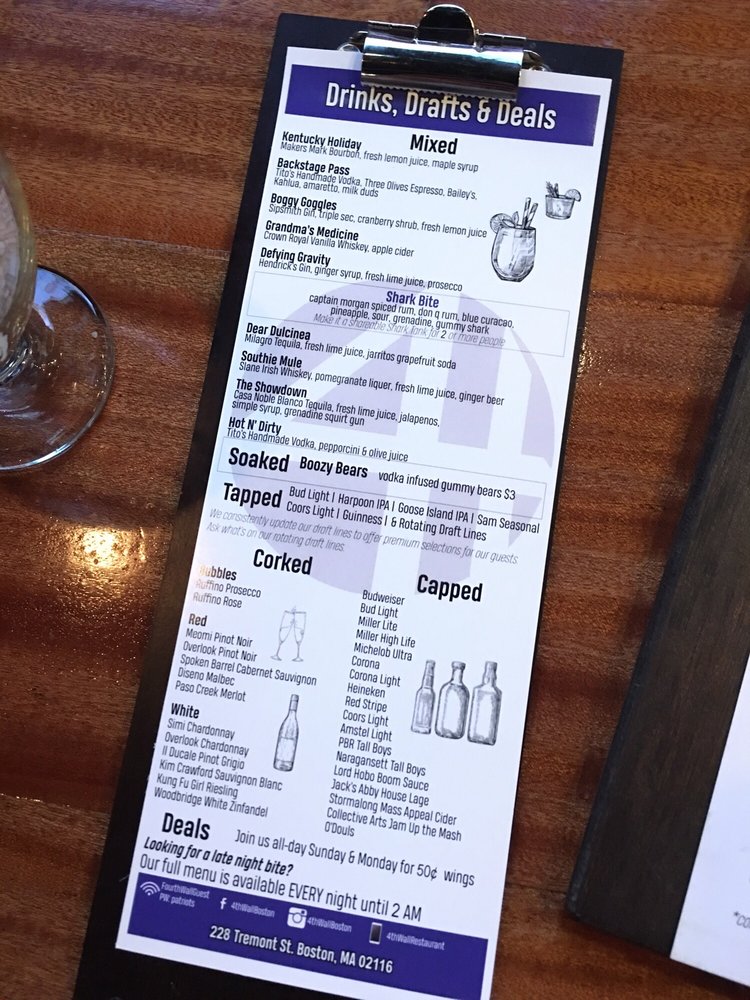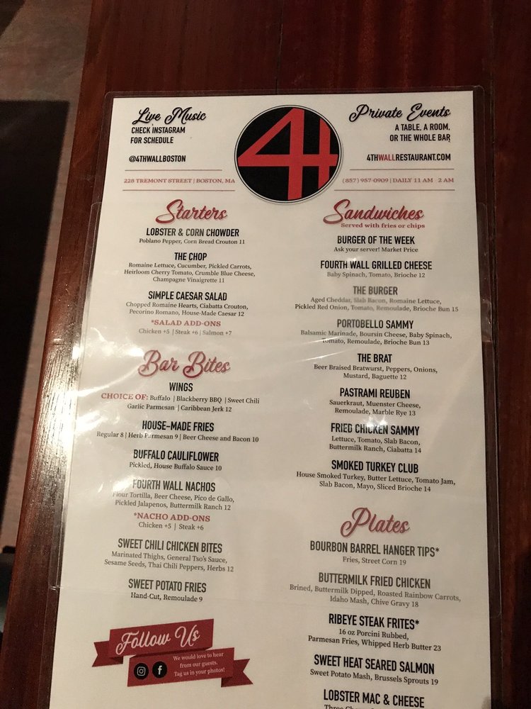 Located in the heart of Boston, 4th Wall Restaurant & Bar offers a unique dining experience combining New American cuisine with a casual pub atmosphere. This establishment takes pride in its inclusive approach, offering a wide range of menu options including pescatarian and vegetarian dishes. The restaurant is known for its friendly staff, strong drinks, and laid-back ambiance, making it the perfect spot for a night out. Customers praise the delicious food, attentive service, and accommodating staff, making it a great choice for those with food allergies or dietary restrictions. With options for outdoor seating, private dining, and even drive-thru service, 4th Wall Restaurant & Bar truly caters to a diverse range of preferences. Whether you're looking for a quick meal to go or a relaxing dinner with friends, this restaurant has something for everyone.